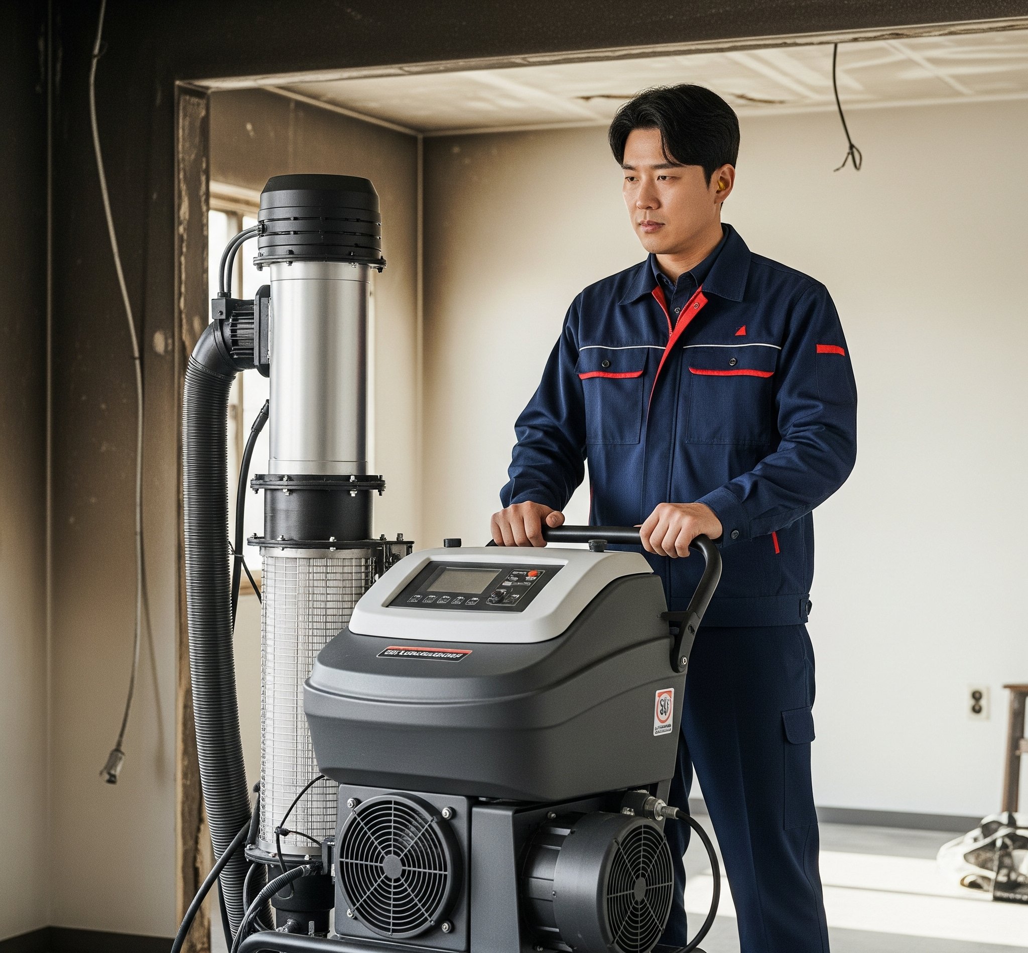 공기 중에 떠다니는 유해 분진을 고성능 집진기로 포집하고, 산업용 전문 탈취 장비(오존 발생기 등)를 이용해 악취의 원인 분자를 근본적으로 분해하여 제거합니다.