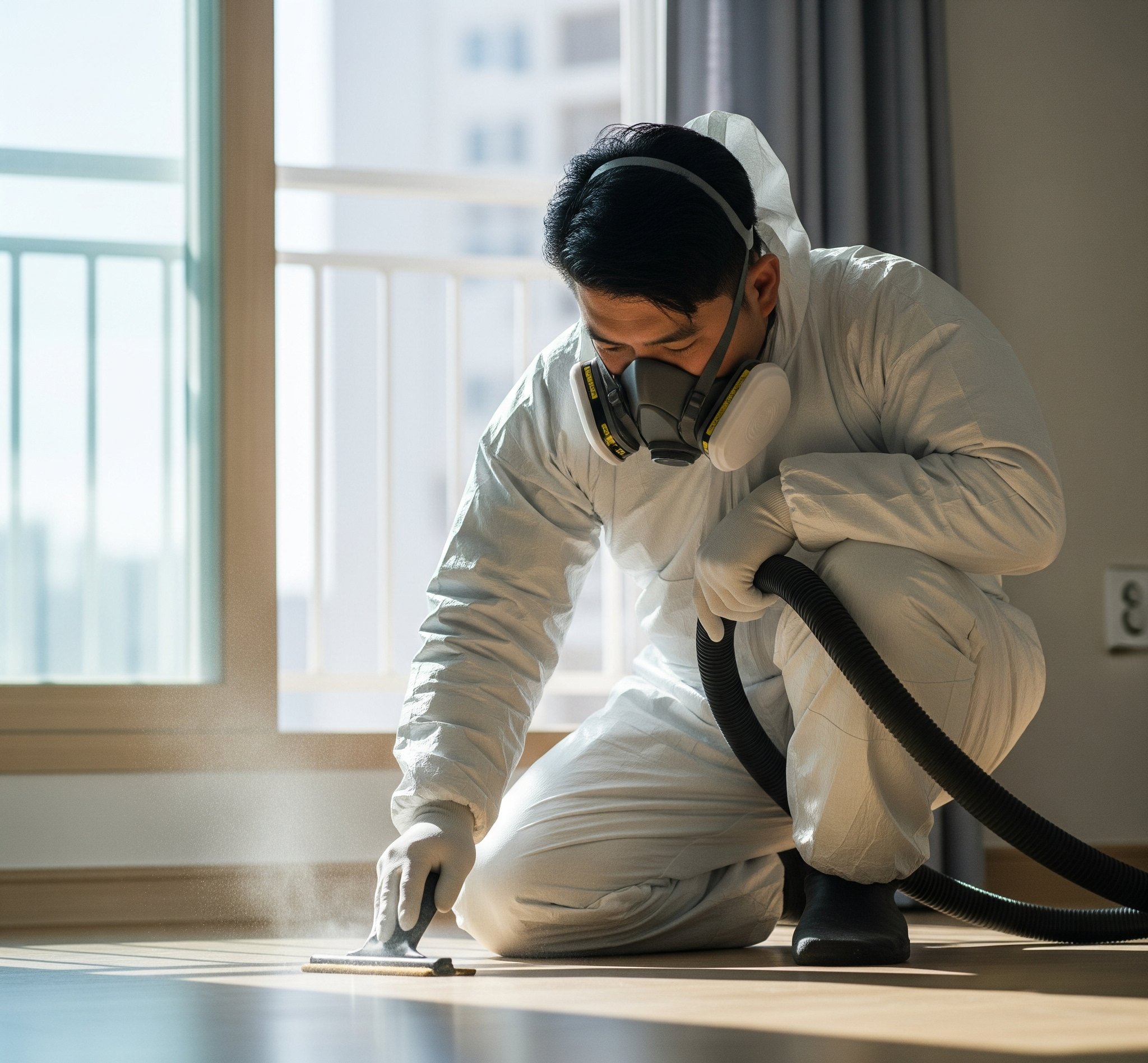 혈흔, 체액 등은 심각한 감염의 원인이 될 수 있습니다. 저희는 특수 보호 장구를 착용한 전문가가 전용 약품과 소독 장비를 사용하여 모든 생물학적 오염원을 완벽하게 제거하고, 2차 감염의 위험을 원천적으로 차단합니다.